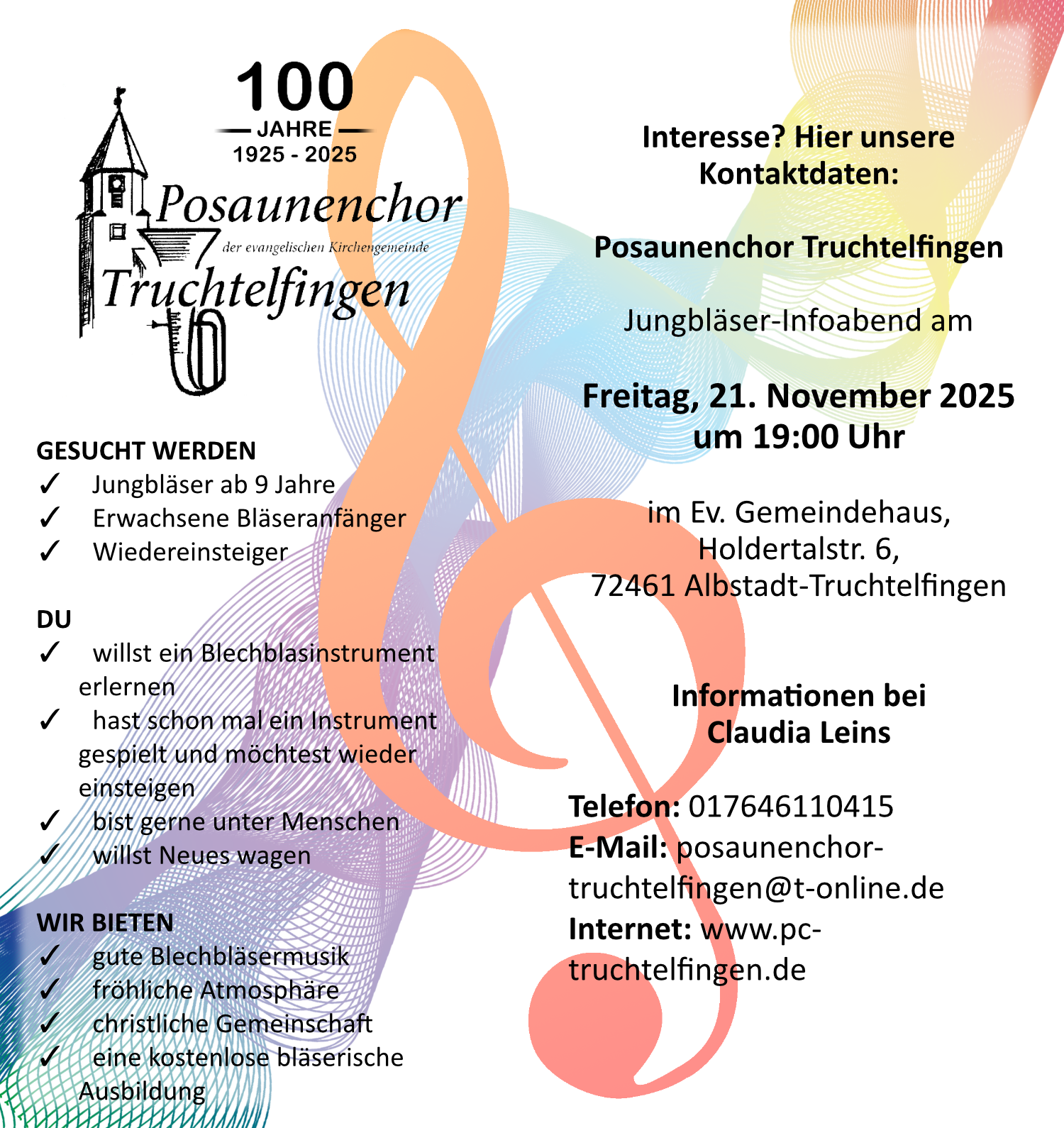 Ob evangelisch, katholisch oder nicht konfessionell gebunden – alle sind willkommen! Angesprochen sind alle Jungbläser ab 9 Jahre, erwachsene Bläseranfänger und Wiedereinsteiger (welche irgendwo schon mal Musik gemacht haben) – alle welche Lust haben, mit uns zu zusammen zu musizieren.
